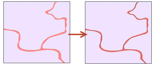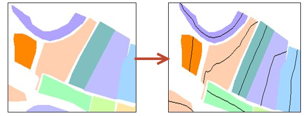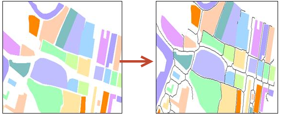 【操作类型】:若选择合并,则“多边形间最小距离”为多边形合并的最小距离,区多边形间距小于该参数值的实现合并;若 选择毗邻,则“多边形间最小距离”为中轴线提取时多边形邻近间距,使两个相邻区图元的共享边分别向中间移动半宽距离。