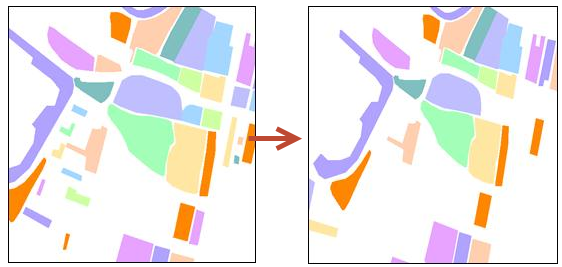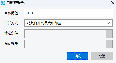 根据设定的面积阈值和筛选条件,自动对整个图层提取满足条件的小面积图元合并到其临近图元中。合并方式有2种:合并到最大相邻区和合并到最长公用边界的邻近面。