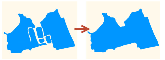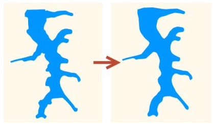 不规则多边形化简主要对不规则的图形进行化简操作,将图元边界弯曲深度小于边界曲线化简弯曲深度参数值的弧段化简成比较自然的曲线线条,适用于湖泊,鱼塘等。