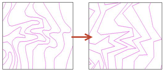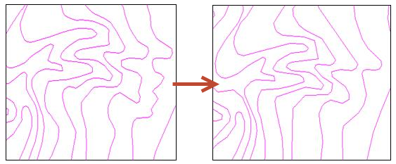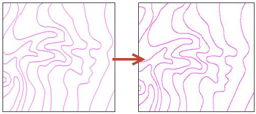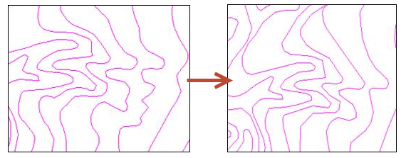 对等高线的线状要素进行化简。在保持整体特征形态的基础上,删除弯曲深度小于参数“等高线删除弯曲的深度”设定值的弧段。