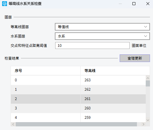 4. 在对话框中选择要进行检查的“等高线图层”和“水系图层”,设置“交点与特征点距离阈值”。