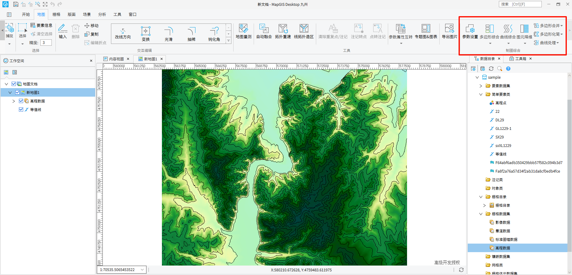 4. 在线图层上直接拉框选取等高线图元进行化简操作。