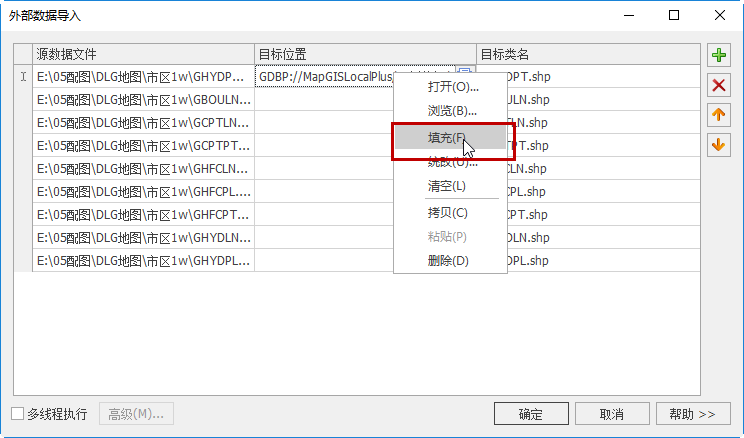 3. 设置目标位置。可选择一个MapGIS GDB路径。在已设置的目标位置上,右键"填充",可批量设置所有数据的目标路径。