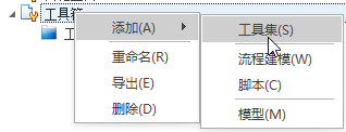 1. 选择某个"工具箱"或"工具集"节点,右键可添加工具集,名称默认为"工具集"。