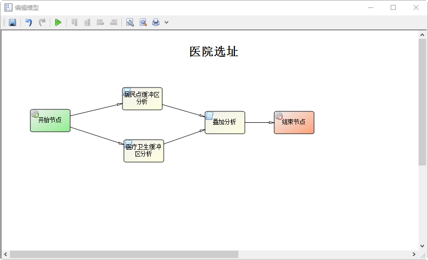 ②以医院选址为例,此次操作涉及到两个缓存分析和一个叠加分析。可通过"追加"功能,分别选择两次缓冲区分析和一次叠加分析,结果如下所示: