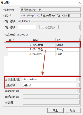 ④双击缓冲分析节点,可编辑参数信息。"选择数据"和"保存路径"均选择"ProcessPara"参数来源类型,过程参数分别对应参数中的"居民点"和"居民点缓冲结果";缓冲半径选择"Constant"参数来源类型,参数值为"1000"。同样方法设置医疗卫生的缓冲区信息。