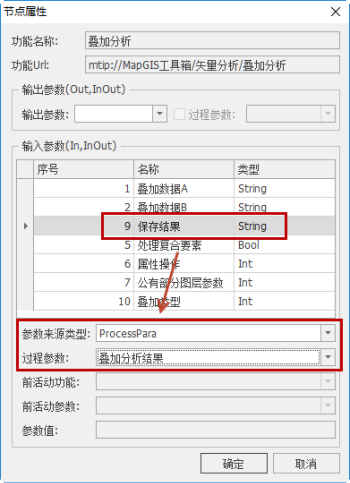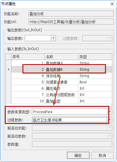 ⑤双击叠加分析节点,可编辑参数信息。参数来源类型选择"ProcessPara",过程参数选择对应结果即可。如下图只罗列了三个参数设置,其他参数类似。