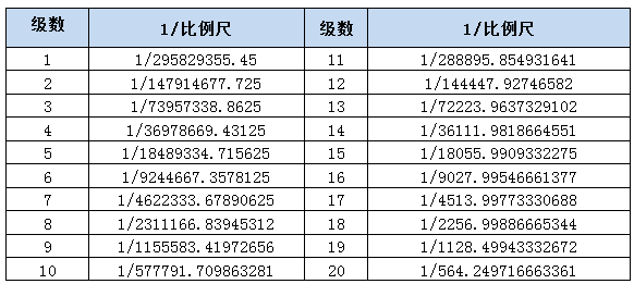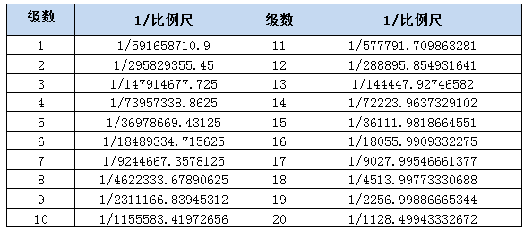 与栅格金字塔中的金字塔层类似,瓦片级数的第1级对应的比例尺最小,表示的地理范围最大,级数增加,对应的比例尺必须大于上一级设置的比例尺,否则裁剪中会报错。