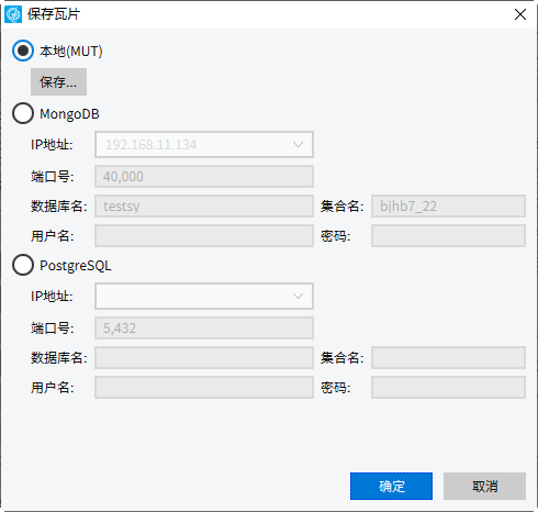 3. 设置瓦片裁剪结果存储路径及名称。目前支持MUT、MongoDB、PostgreSQL存储。