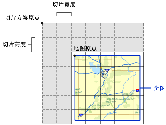 切片方案原点是指切片方案格网的左上角。原点不一定代表创建瓦片的起始点。使用公用切片方案原点可以确保它们能够相互叠加与合并。