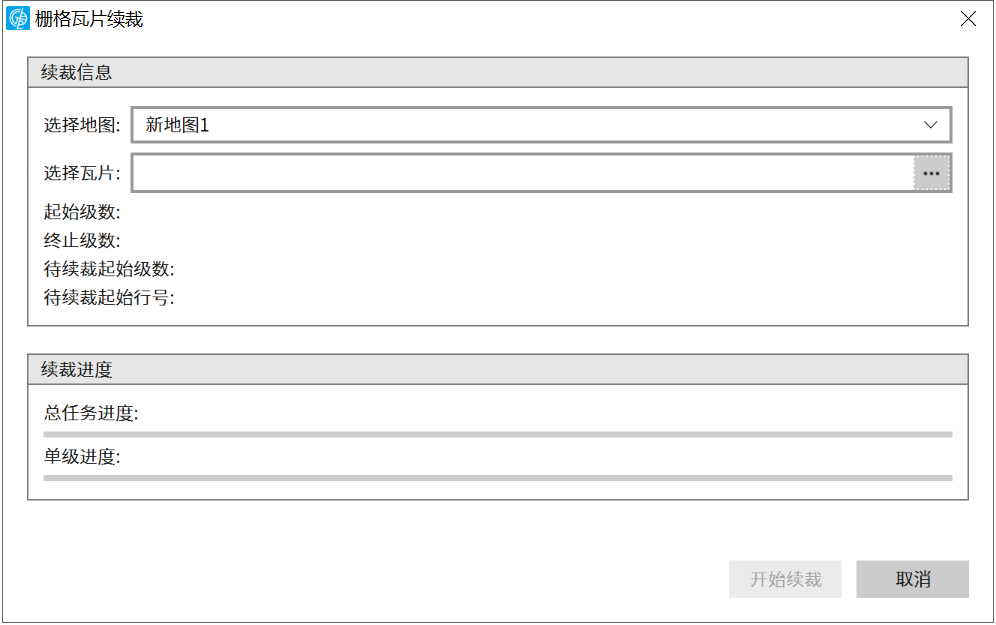 4. 点击“开始续裁”按钮执行瓦片续裁操作,当总任务进度达到100%,即完成栅格瓦片的续裁。