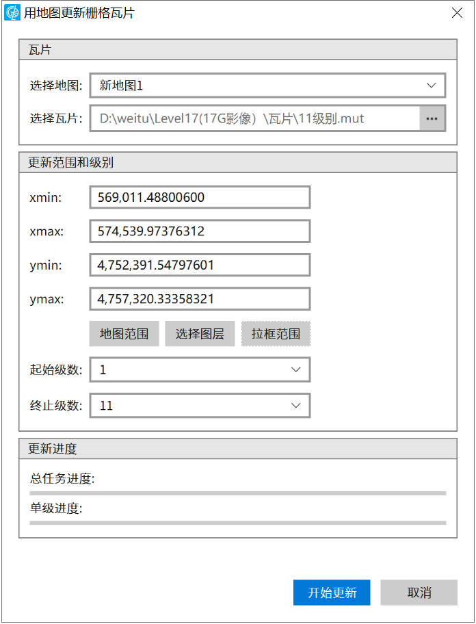 5. 完成设置,点击“开始更新”按钮,进行瓦片更新,当更新的总任务进度达到100%,即完成页面瓦片的更新。需要注意的是瓦片更新会改变原始瓦片数据,并且过程是不可逆的。建议将待更新瓦片先进行备份,可用于更新出现错误时的补救等。