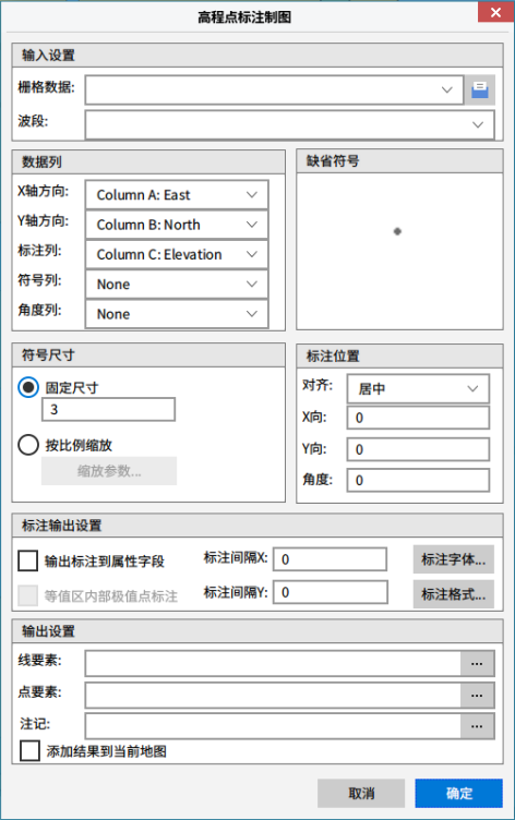 1. 单击“栅格”->“制图输出”->“高程点标注制图”功能,系统弹出如下对话框: