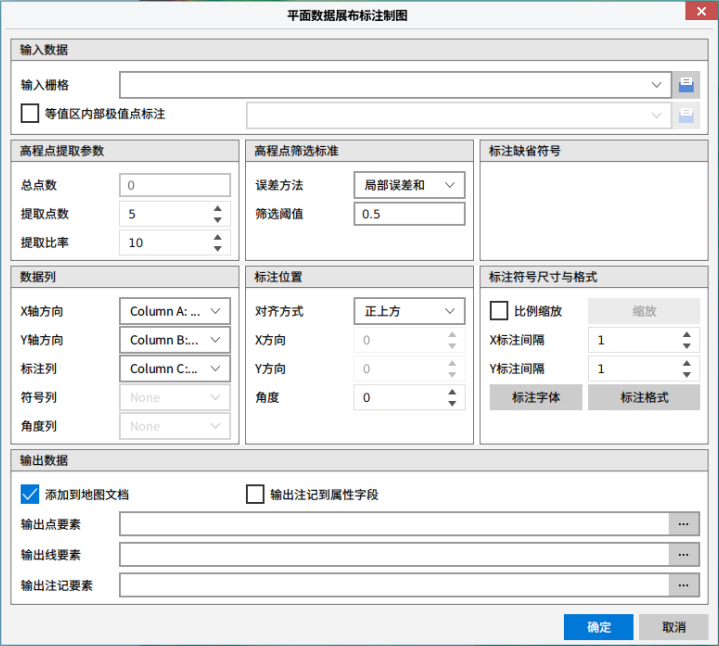 3. 设置输出点/线/注记要素,点击“确定”执行平面数据展布标注制图操作,点击“取消”可取消当前操作。