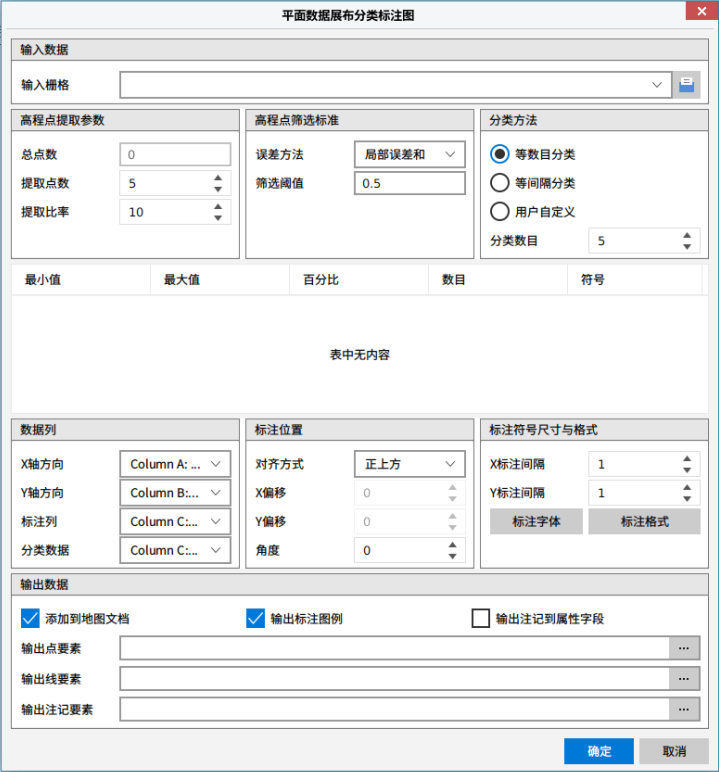 3. 设置输出点/线/注记要素,点击“确定”执行平面数据展布分类标注操作,点击“取消”可取消当前操作。