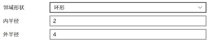 - 【高度/宽度】:设置邻域的大小,当邻域形状设置为矩形时用于设置矩形的高度和宽度;当邻域形状为圆形时,需要设置半径;当邻域形状为环形时,需要设置内半径和外半径;为楔形时,需要设置半径、起始角度和终止角度。