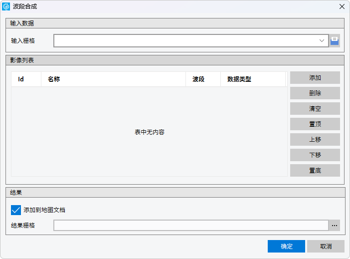 - 【置顶/上移/下移/置底】:设置影像列表中的波段顺序,此顺序影响输入波段在结果栅格中的波段序号。