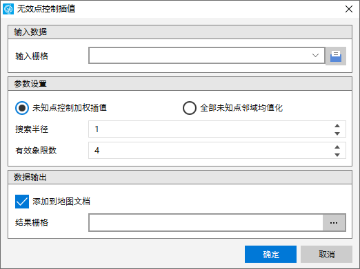 2. 输入栅格数据,进行参数设置。用户可选择“未知点控制加权插值”和“全部未知点邻域均值化”两种控制方式。