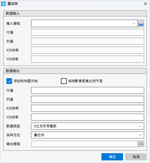 ②输入分辨率:用户也可以选择自定义输入采样后的分辨率。同样,若勾选“保持影像高宽比例不变”,在输入X/Y值的任意一个后,另一个会按比例自动生成;行列值也会自动生成。分辨率是栅格一个像元代表的刻度距离,值越大,分辨率越低。