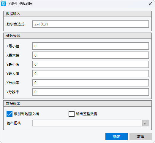 函数生成规则网是根据用户所指定的函数和数据范围,生成新的栅格数据集。
