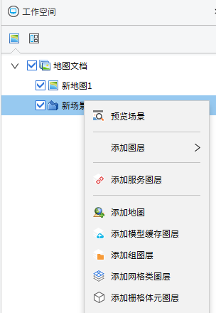 1. 在"工作空间"中右键"地图文档"添加场景;