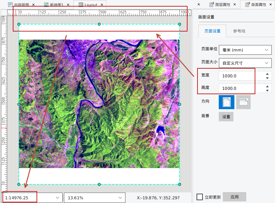 将版面与排版框的高度/宽度设置为1000*1000,排版框中复位数据,此时版面显示比例尺为1:14976.25。