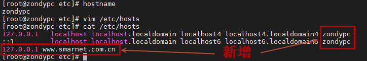 1. 查看hostname信息,并将hostname和"127.0.0.1 www.smarnet.com.cn"添加到hosts配置文件中。添加完成后,可通过“cat /etc/hosts”命令查看信息,确认已成功添加。