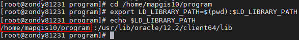 #locale -a3. 已安装解压MapGIS环境后,进入“/mapgis10/program”目录,将其添加到环境变量LD_LIBRARY_PATH(/home/mapgis10/program为MapGIS安装目录)。添加成功后,可通过“echo $LD_LIBRARY_PATH”显示环境变量信息,已包含mapgis安装路径。