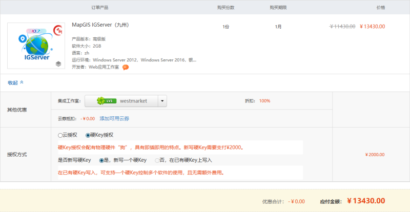 4. 进入“确认订单”页面,可查看订单详细信息,选择“硬Key授权”模式;