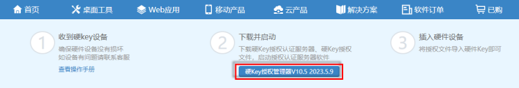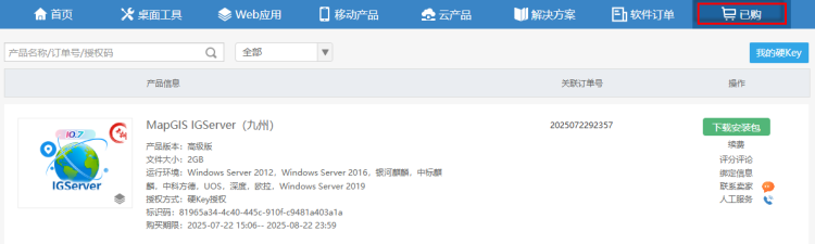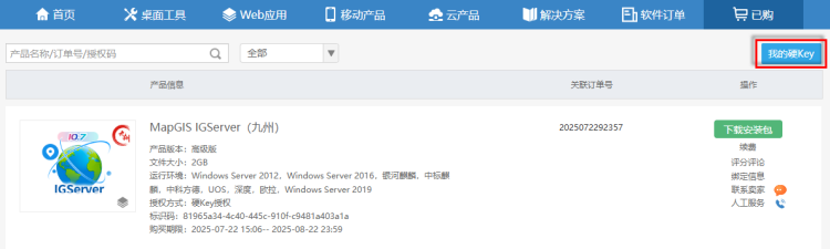 3. 在“云交易中心”-“已购”中选择产品,点击“下载安装包”,可下载“硬Key授权文件”