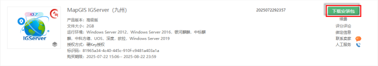 当“云交易中心”中MapGIS IGServer(九州)产品更新后,用户可在“已购”信息中获取最新的产品安装包,解压后直接替换原始安装环境即可。
