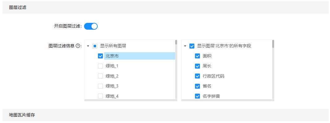 - 【图层过滤】默认呈关闭状态,即所有图层和字段可以查询。打开后可选择图层查询过滤,勾选允许查询的图层和字段,确认发布。