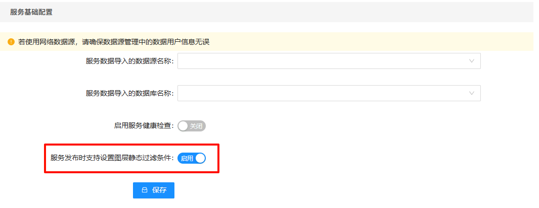 - 使用【图层过滤】,需要通过配置项控制是否开启服务发布时支持设置查询过滤条件。进入【设置】-【服务管理配置】,打开“服务发布时支持设置图层静态过滤条件”启用并保存。