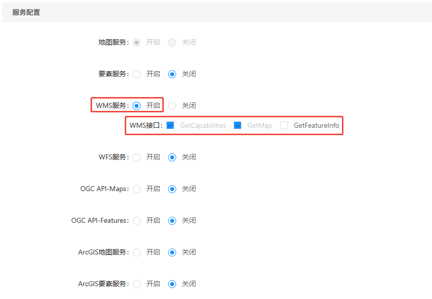 【WMTS服务/OGC API -Tiles】:对于开启了动态切图的二维地图服务,可以选择将动态裁切的瓦片支持的WMTS服务/OGC API -Tiles,开启后,可勾选所支持的接口类型;