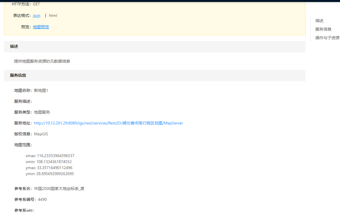 - 发布地图服务成功后,点击进入服务详情页面,点击地图服务的服务地址,可进入查看地图服务基地址页面。