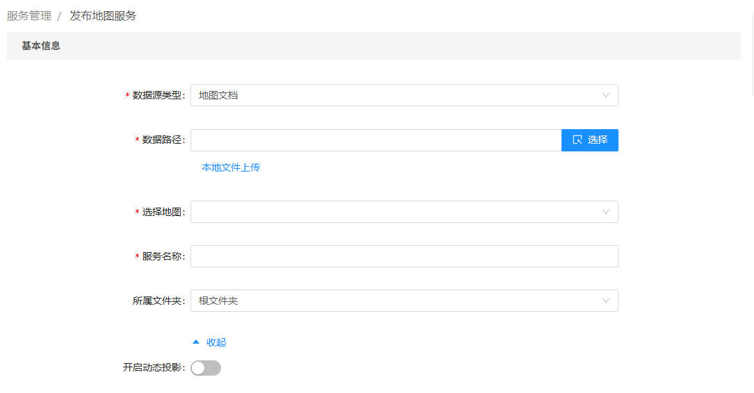 - 地图文档:MapGIS地图文档,其中需包含二维地图,可以选择文件夹管理中的数据,也可以直接上传本地文件;