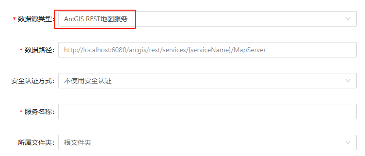 数据路径: 输入服务的URL地址;安全认证方式:可选择不使用安全认证、用户名/密码、Token三种方式;