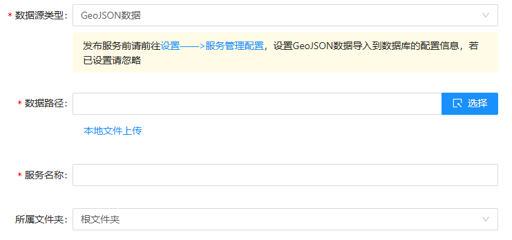 - GeoJSON数据:设置GeoJSON数据导入的数据源配置后,可以直接将GeoJSON文件发布为地图服务,可以选择文件夹管理中的数据,也可以直接上传本地文件;