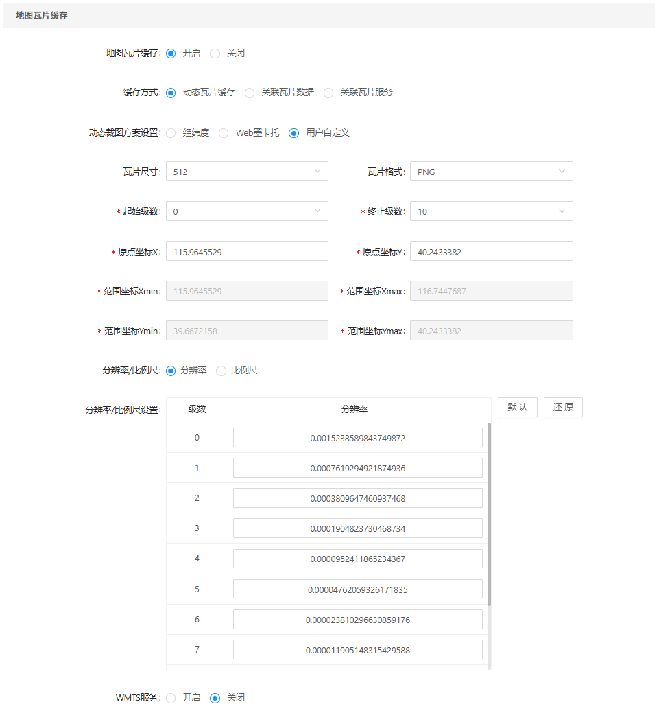 - 分辨率/比例尺:设置每个裁图级别的分辨率/比例尺,可以自定义每个级别分辨率/比例尺,或者使用默认的分辨率/比例尺(两个相邻级别分辨率/比例尺为2倍关系);