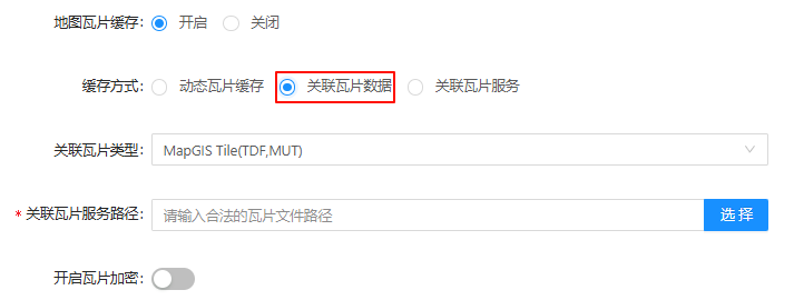 【缓存方式】:可选择动态瓦片缓存、关联瓦片数据、关联瓦片服务三种缓存方式;