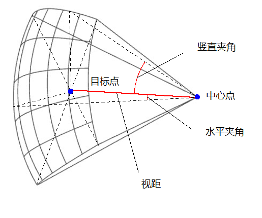 - 【视角】:观察点到目标点的方向沿着XY轴和Z轴分别平移的角度,这个角度决定了可视域水平方向和竖直方向上的距离;
