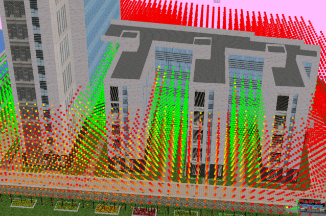 3. 点击"分析",在场景视图中交互绘制多边形区域,右键结束绘制。可利用若干点表示该区域的阴影率。如下图所示,红色点代表区域时间内该坐标处始终处于非阴影状态,绿色点代表区域时间内该坐标处始终处于阴影状态。