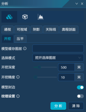 1. 进入SceneViewer视图,点击右侧工具栏的"分析 "功能,切换到"开挖"面板: