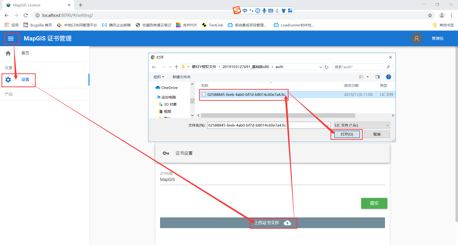 4. 点击MapGIS证书管理左侧按钮,点击设置按钮,进入设置主界面,点击【上传证书文件按钮】,弹出窗口,选择下载的硬狗授权文件,即可加载产品授权信息。
