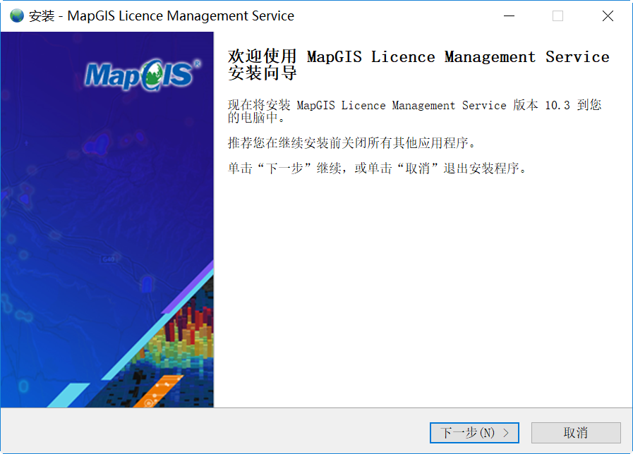 1. 在客户机上运行“MapGIS Licence Management Service Setup.exe”,弹出如下所示的对话框: