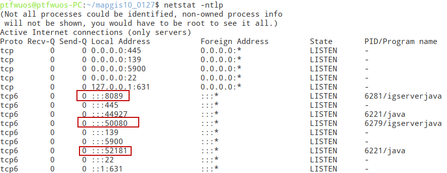 7. 执行netstat -ntlp命令,观察52181端口、8089端口是否启动成功。若授权成功后,会再增加启动50080端口;