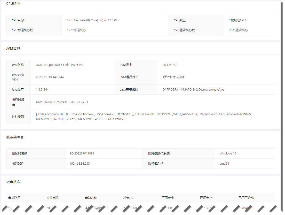 服务器监控显示该IGServer客户机的计算机使用性能,包括CPU占用率、实时内存占用率、实时读取速度、实时下载速度、CPU监控、JVM信息、服务器信息、磁盘状态等信息。