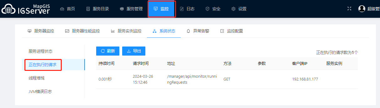 2. 正在执行得请求,查看、导出正在执行的请求信息。