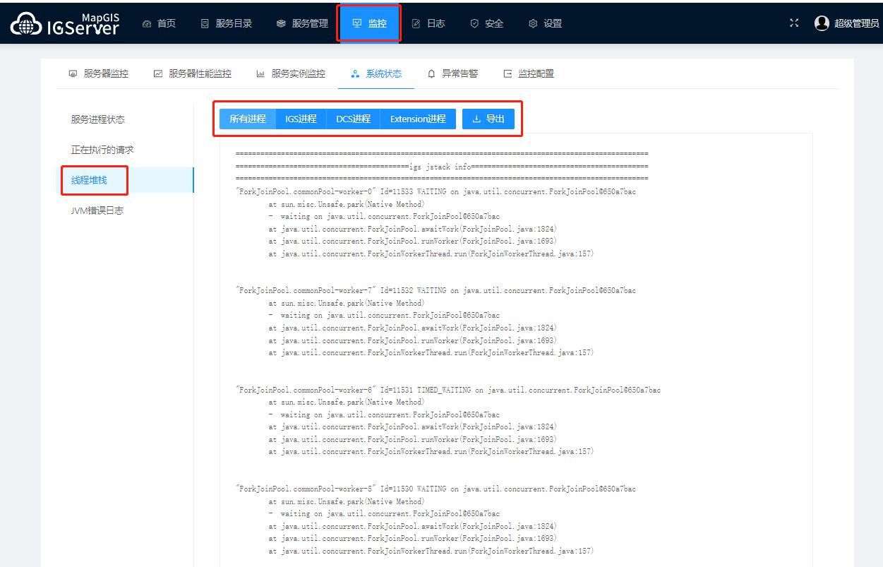 3. 线程堆栈,提供各个进程的日志打印。包括示igs进程、dcs进程、扩展服务进程。
