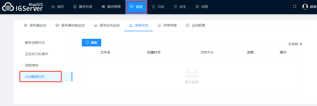 4. JVM错误日志,可在页面上查看所有JVM崩溃日志。如果在igserver_for_java/logs文件夹下有hs_err_pid.log文件,则页面上可查看(可手动拷贝测试文件到logs文件夹下)。支持查看日志内容,并有高亮着色,支持导出文件。